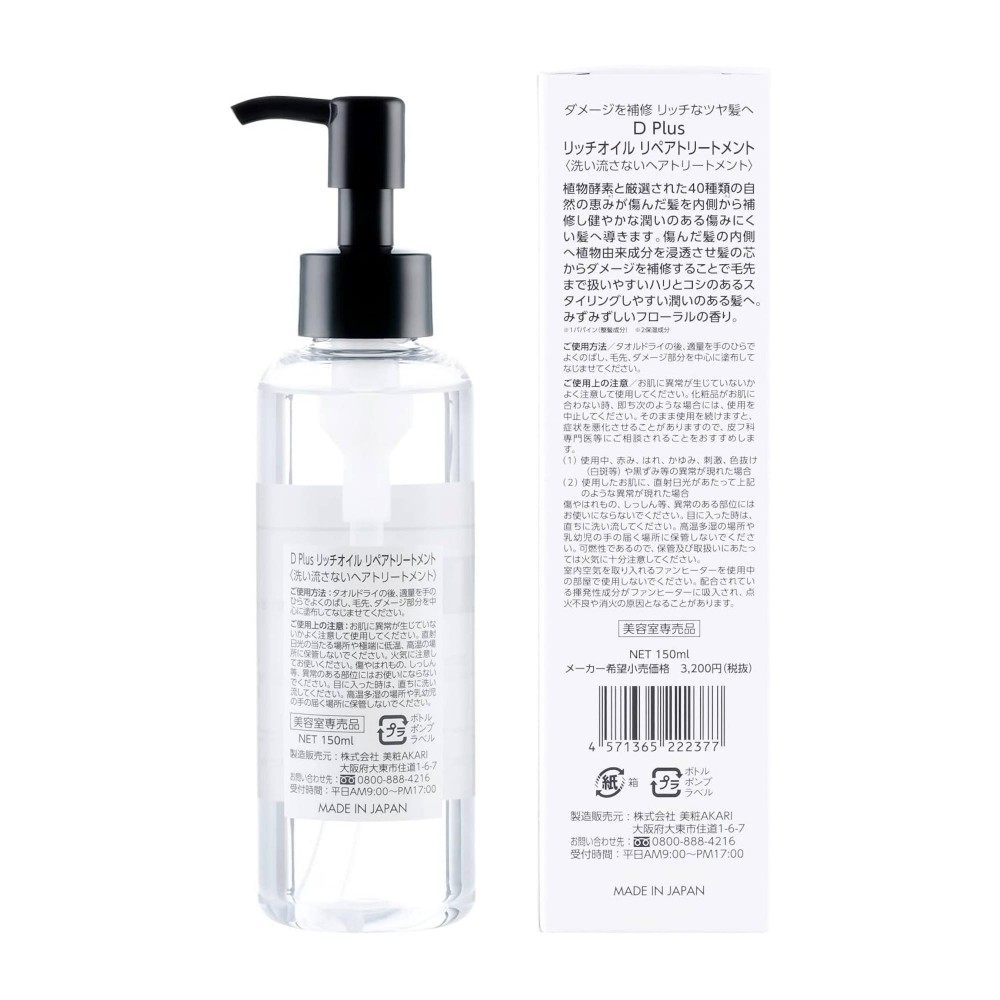 Несмываемое масло для волос D Plus Rich Oil Repair Treatment — интенсивное лечение для повреждённых, сухих и безжизненных волос. Формула на основе 40 природных компонентов, растительных ферментов и масел (арганового, ши и камелии) проникает в самую сердцевину волоса. Волосы становятся крепче, гуще, с здоровым блеском и шелковистой гладкостью.